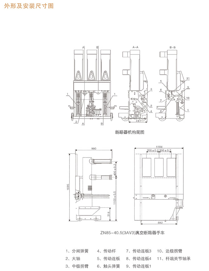 断路器采用灭弧室在上.机构在下的整体布置的结构,利于调试。